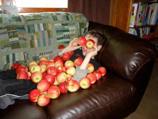 I use this picture quite a bit because it is a great illustration of the silliness that often goes on in my house. Very often said silliness is instigated by our second son. (Who is the one under the apples in this picture.) I don’t use my kids names online so you are just going to have to know him as our second son.